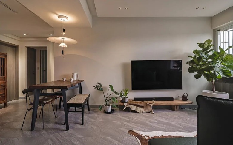 复古风设计 每天给你分享一个案例设计 面积:92.4㎡ 设计: 把所有喜欢元素,放进生活里。 两夫妻将各自心所属之爱纳入家中 立面仅以白色漆料覆面,天花板是简约平钉手法 ,使天地维持平整视觉,保留原本完整窗型 下方以木工施作收纳柜,主牆仅摆置天然实木 饰上动物皮草,以轻盈姿态,与后方大型书柜墙相衬 选以深色木工贴皮为整列书墙 并均分大型窗格,无论是书籍与展示品 皆能灵活摆置,为契合屋主不喜过多固定式家具 沙发择一座活动式靠背沙发,当靠枕轻取下时 沙发瞬时像一屿小岛漂浮