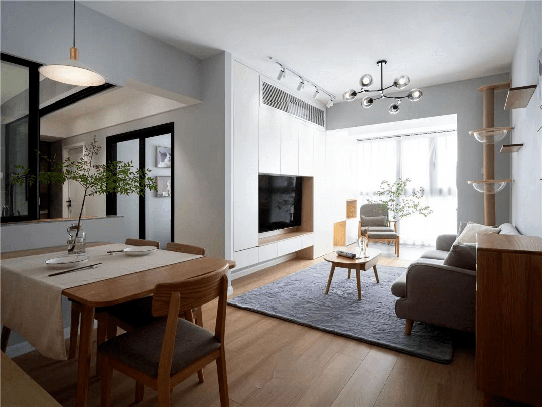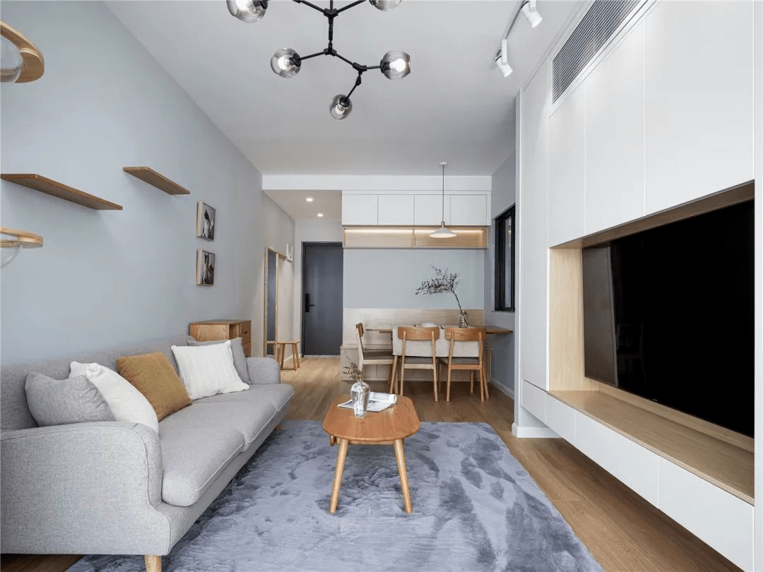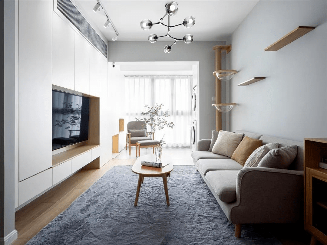 客厅采用电视柜收纳的形式设计,整面白色的内嵌式封闭墙柜,整洁清爽,收纳空间巨大,底部悬空方便卫生打理。