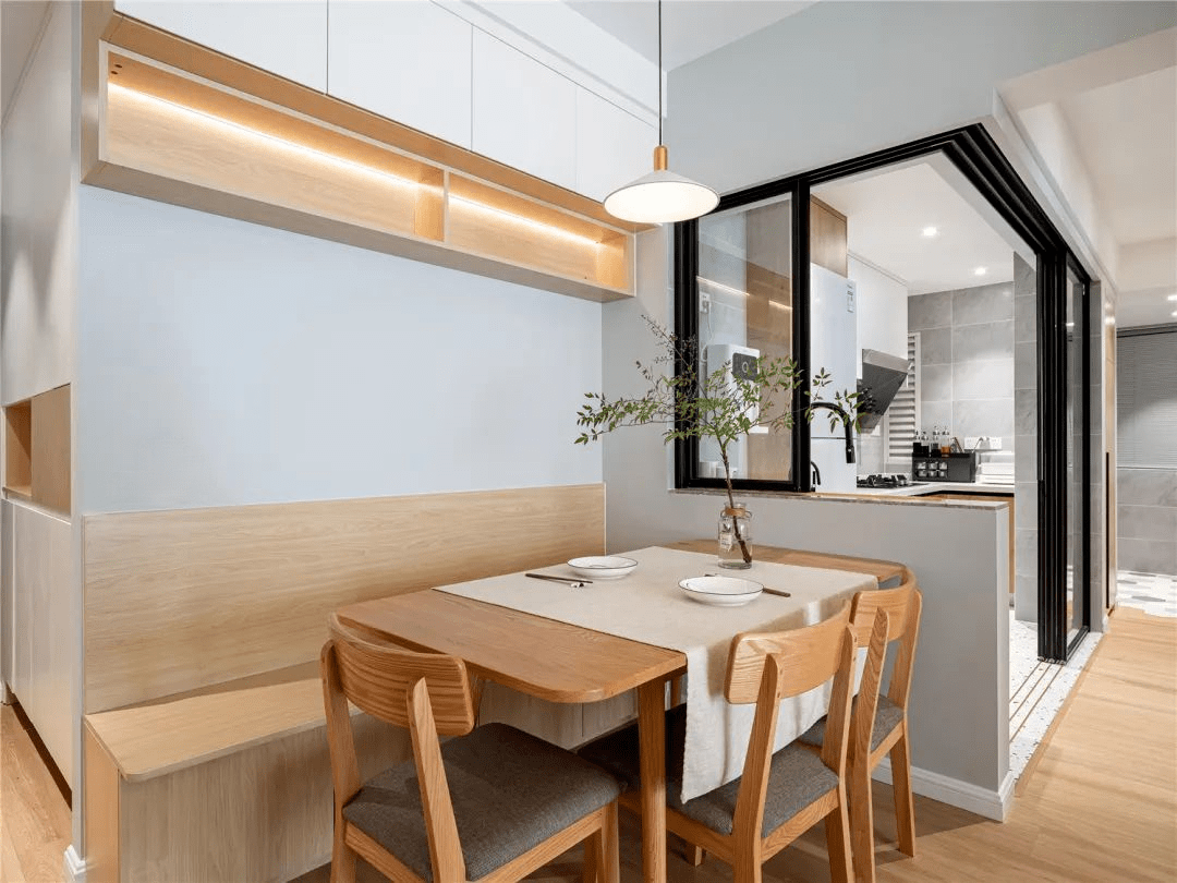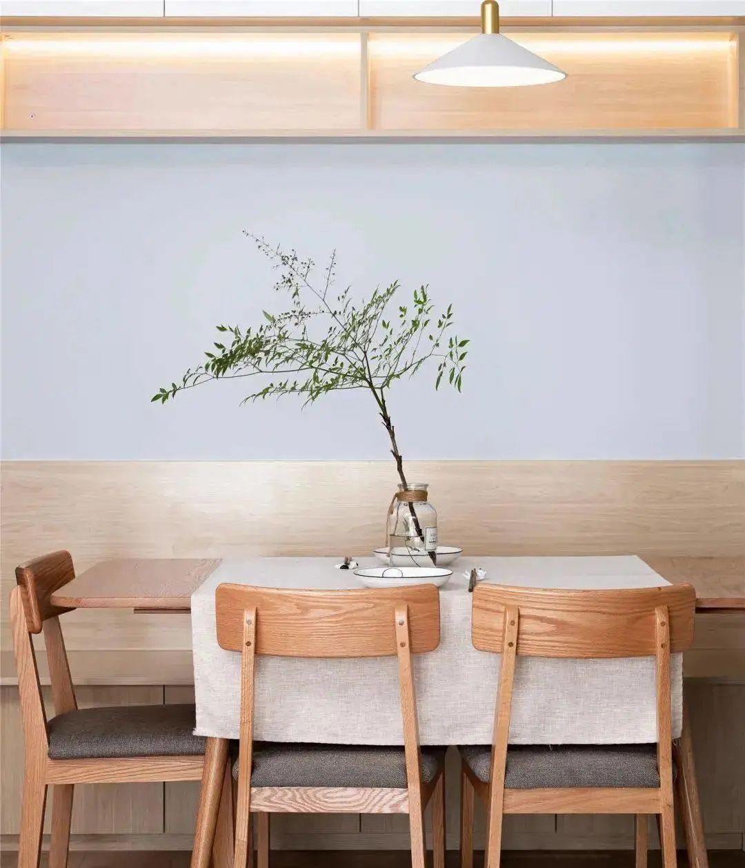 简约的原木色餐桌椅、卡座及墙上的开放式储物格,在花瓶中绿植的衬托下,营造出温馨舒适的就餐环境。