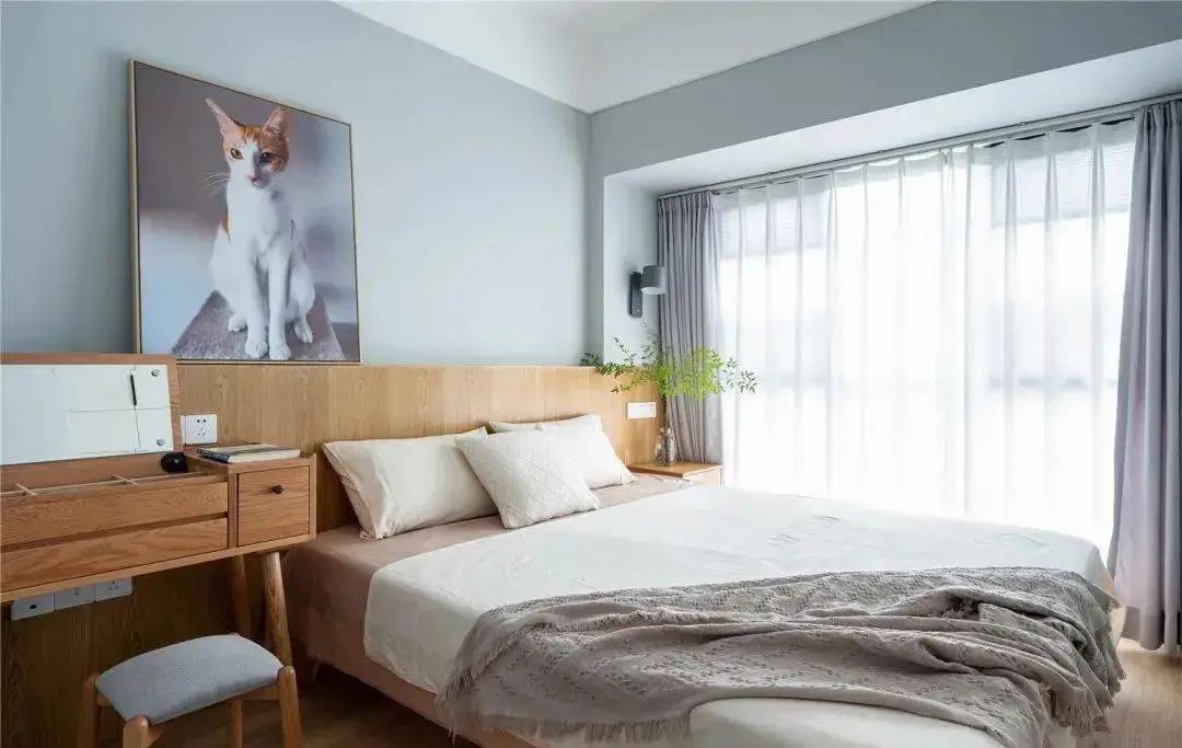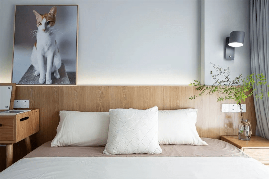 卧室床头采用通体式设计,化解了窗口墙垛处鸡肋空间不好摆放床头柜的尴尬,原木颜色温暖大气,为卧室营造安静温馨的睡眠环境。