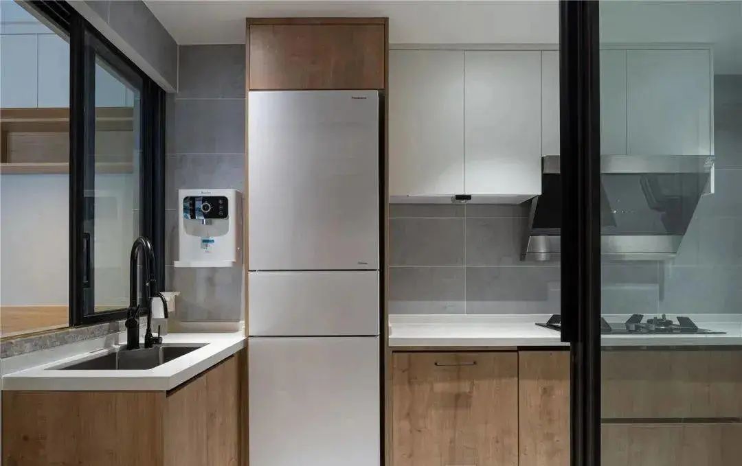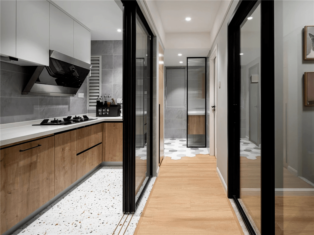 厨房将原有非承重墙拆除,更换成三联动推拉门,让厨房采光效果更好,开放洞口更大。