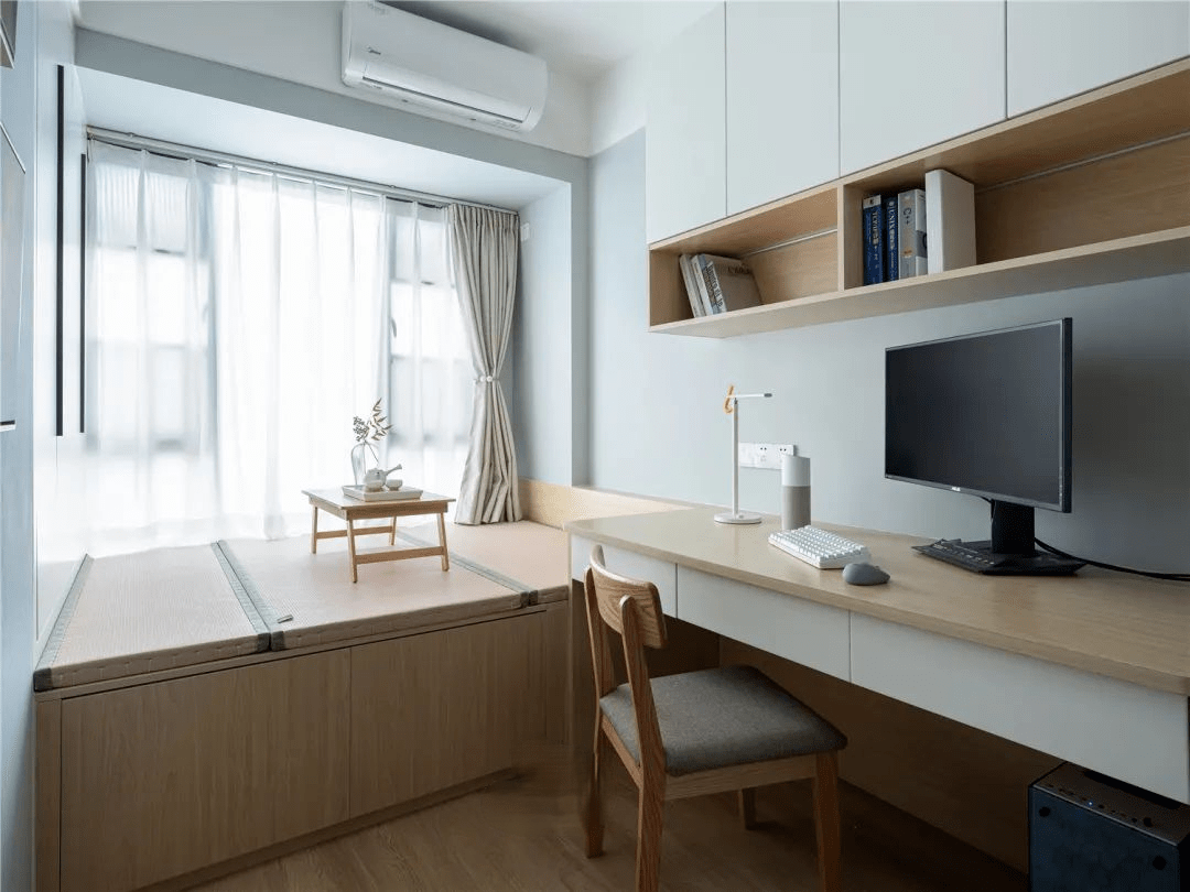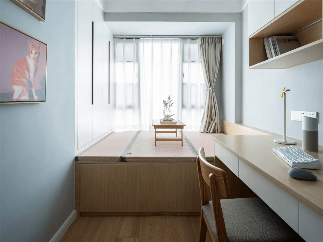 次卧相对小一些,采用榻榻米床+书桌书架的形式设计,既具有茶室的功能,又能学习办公,还是小户型收纳的神器。