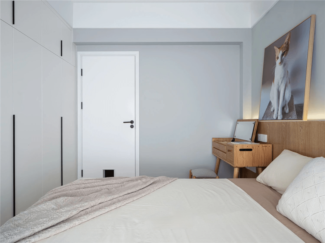 白色的通顶衣柜美观实用,为各种衣物及床品的收纳提供巨大空间。