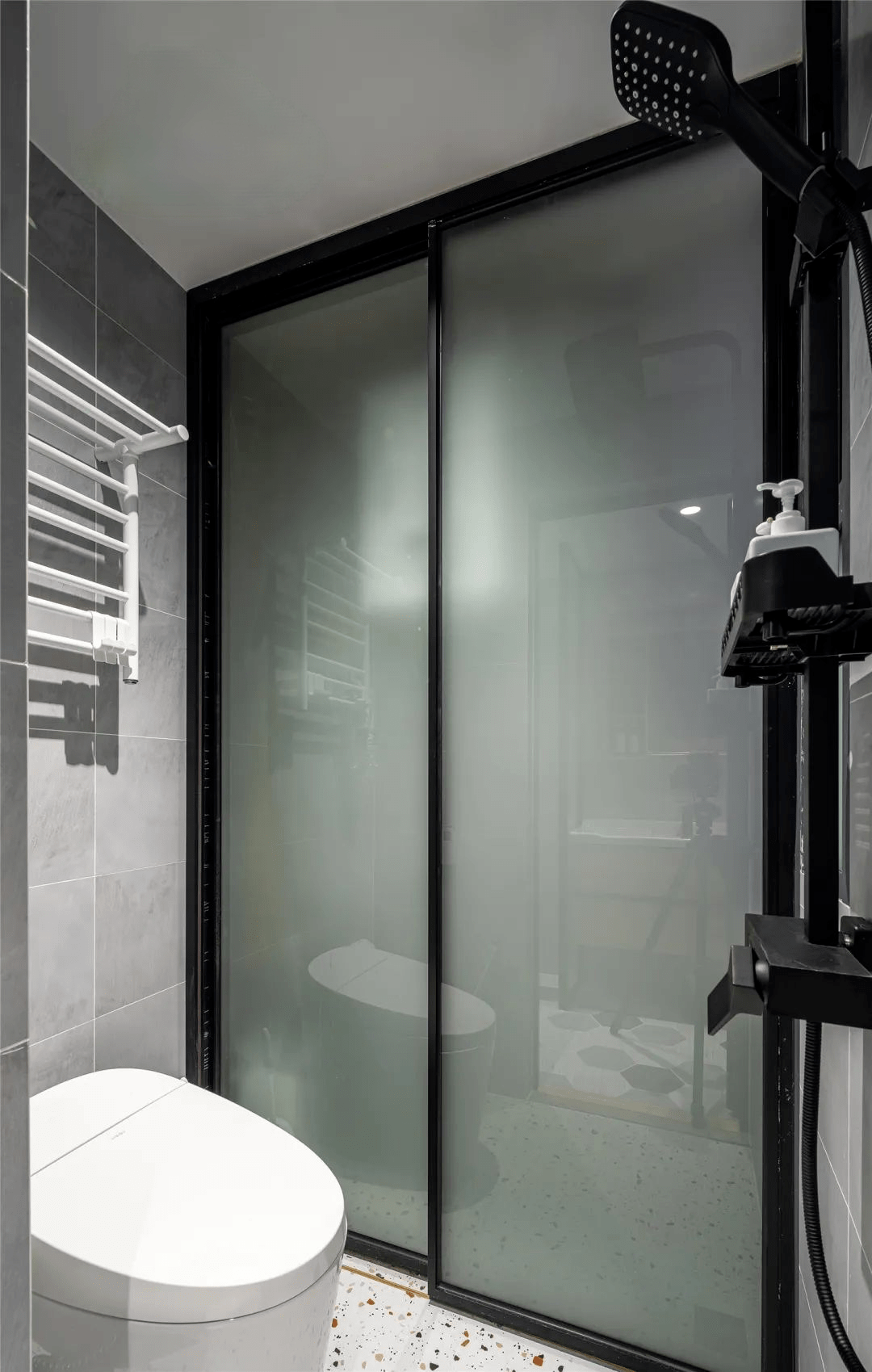 湿区的设计也很紧凑,品质感十足,黑白灰搭配的洁具和墙面,低调奢华,沉稳而大方得体。