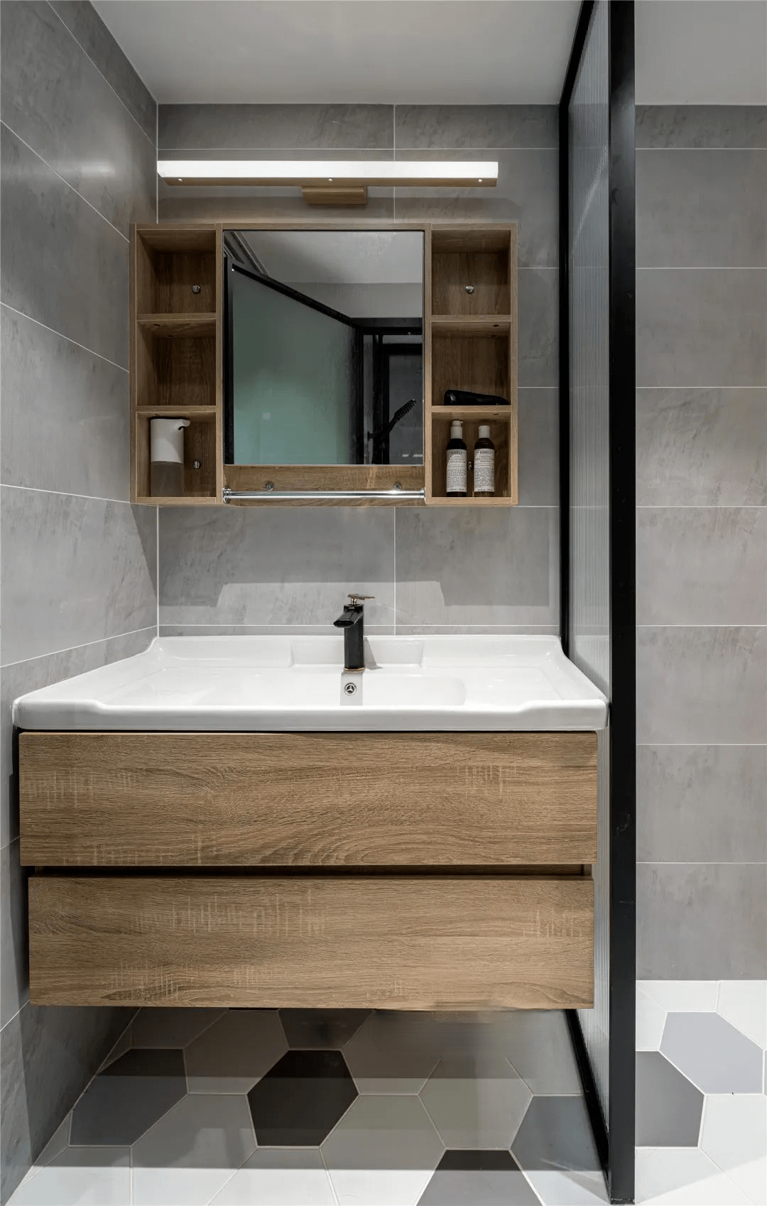 卫生间采用干湿分离设计,独立的洗手台精致简约,颜值很高,台下储物悬空设计,避免潮湿还易于打理,六角砖也是很流行网红款,经典时尚空间感强。