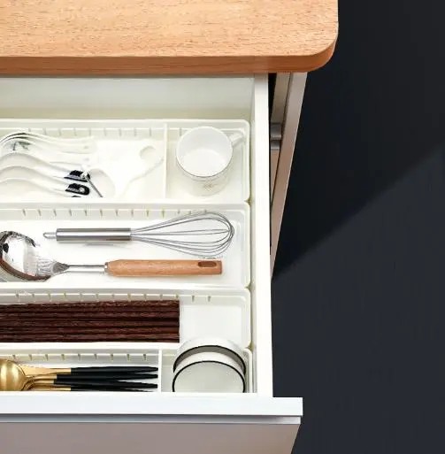 尽量把厨具放在竖起来的收纳盒里,方便拿取。也可将餐具分类放置。