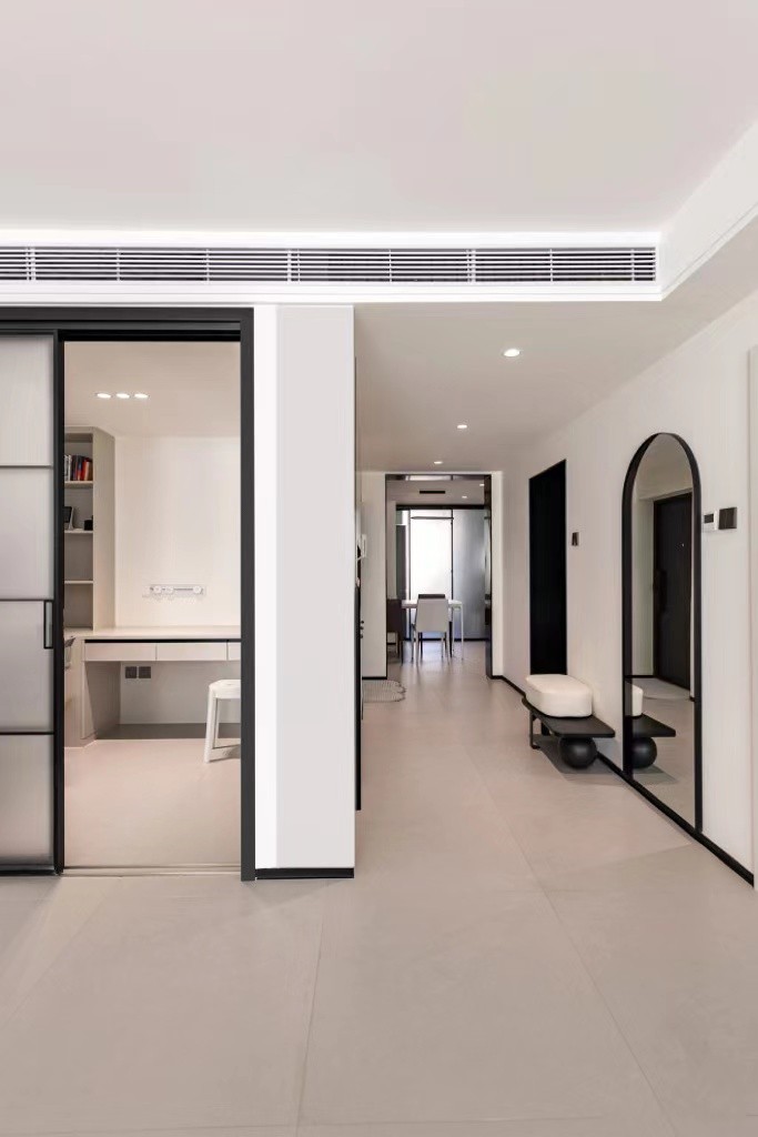 玄关玄关鞋柜是做到顶的设计既增加了储物空间而且上方不会有灰尘鞋柜中部留空 平时下班可以随手放点钥匙底下留出一定的空间方便放换下的鞋子另一面设置了换鞋凳和穿衣镜放在鞋柜对面 方便实用 客厅非常现代的电视背景墙设计通刷奶油色乳胶漆让空间看起来更加干净家具选择也是简洁为主不过分花哨客厅连通书房规划为一体化半开放式格局平时可以在书房工作办公 厨房做了可拉伸的活动餐桌充分利用空间作为收纳 主卧衣柜采用无把手设计和梳妆柜采用一体化设计衣柜通顶大大提高了空间利用率