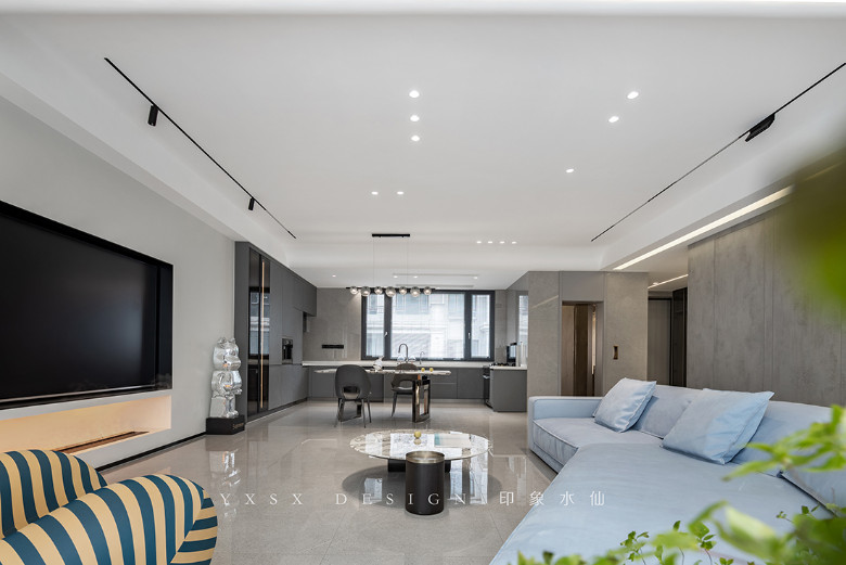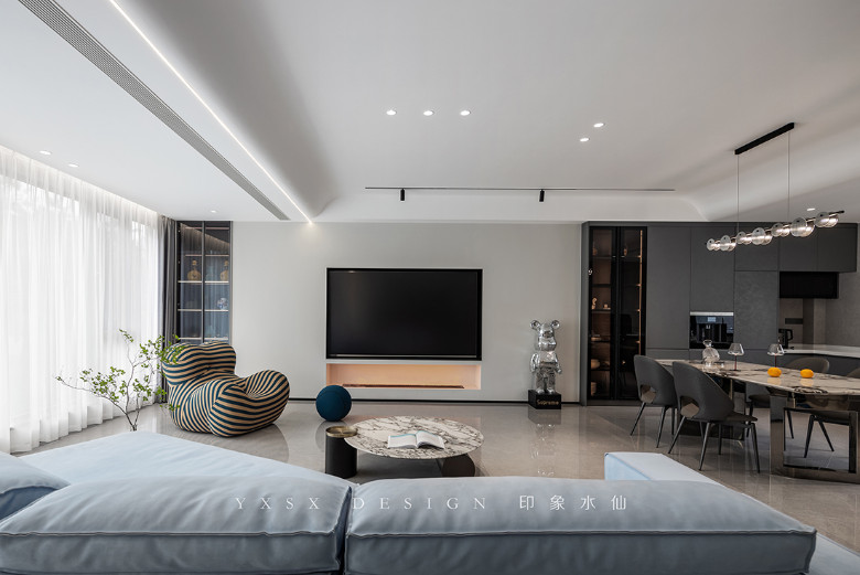 共享空间大面积落地窗大量引入室外光线,客厅、餐厅在一条动线,家人之间的互动感更强,视觉上也更为通透轻盈,减少压抑感与封闭感,并且无主灯设计也提高了层高。
