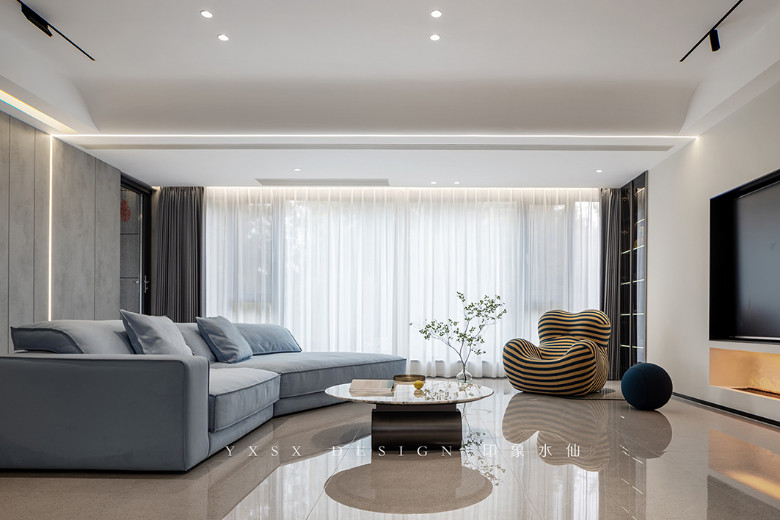 电视背景融入灯带设计,围合出更好的家庭休闲氛围,地面铺设的灰色地砖配上白色系电视背景,暗与明,刚与柔,和谐共存,简约大气却也不失家的温暖。
