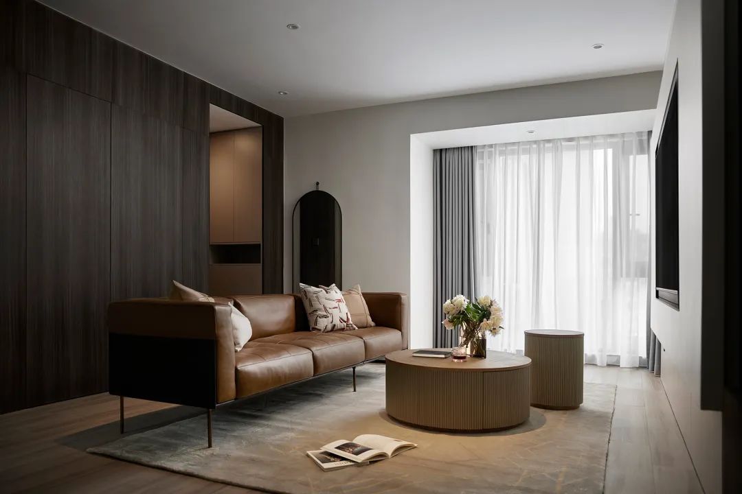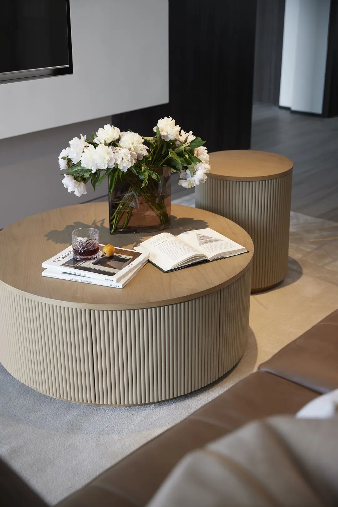 质朴厚重的木质圆形茶几自带收纳功能,将功能与美学结合得恰到好处。