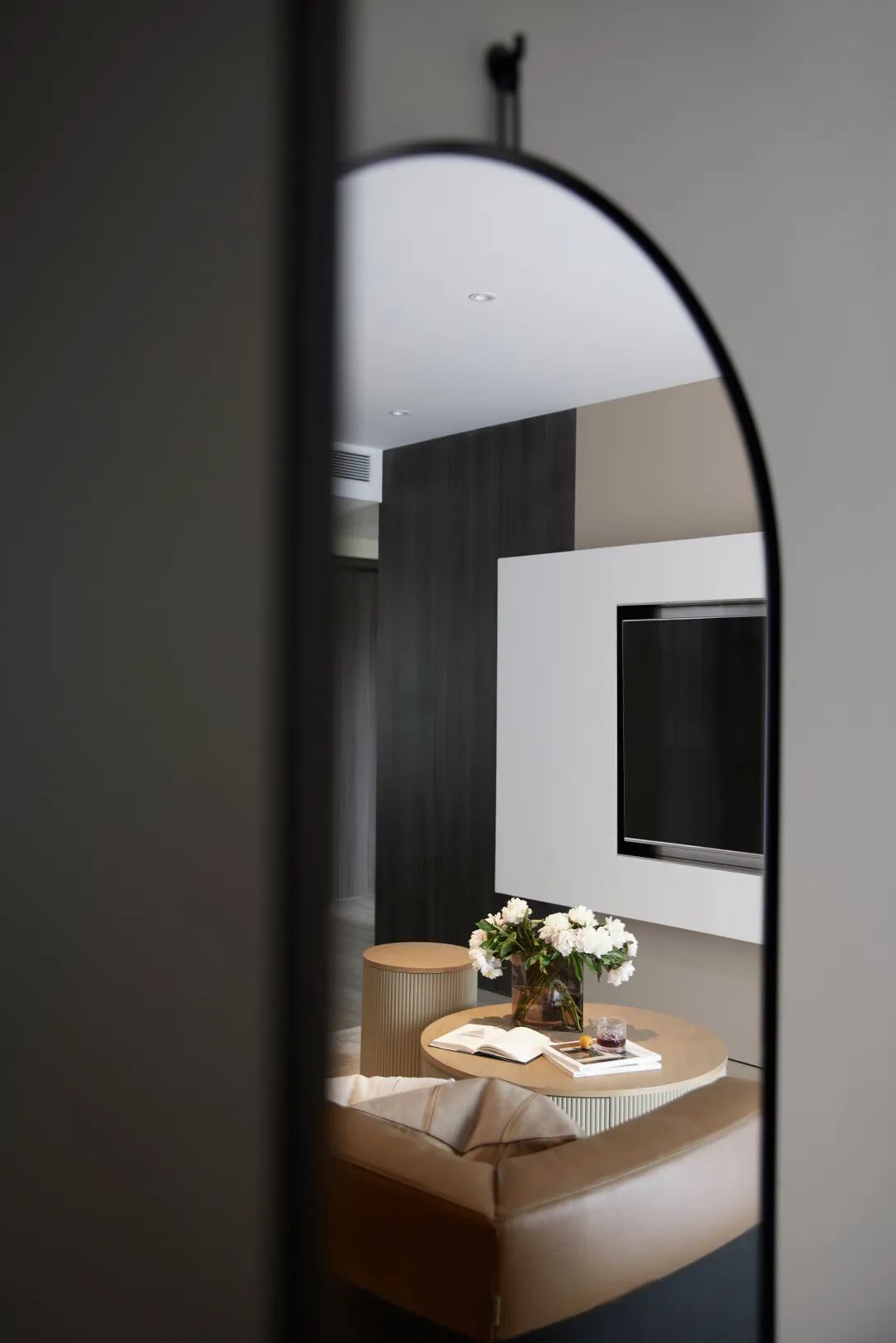 落地镜的置入,扩宽了空间的深度,使之呈现出更饱满、立体的效果,丰富了空间的层次表达。