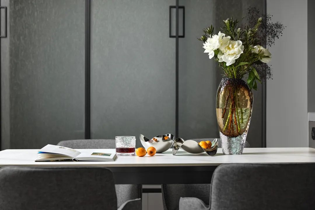 餐桌拥有着雅致的白色理石台面,淡淡的水墨纹路缓缓流动铺展。