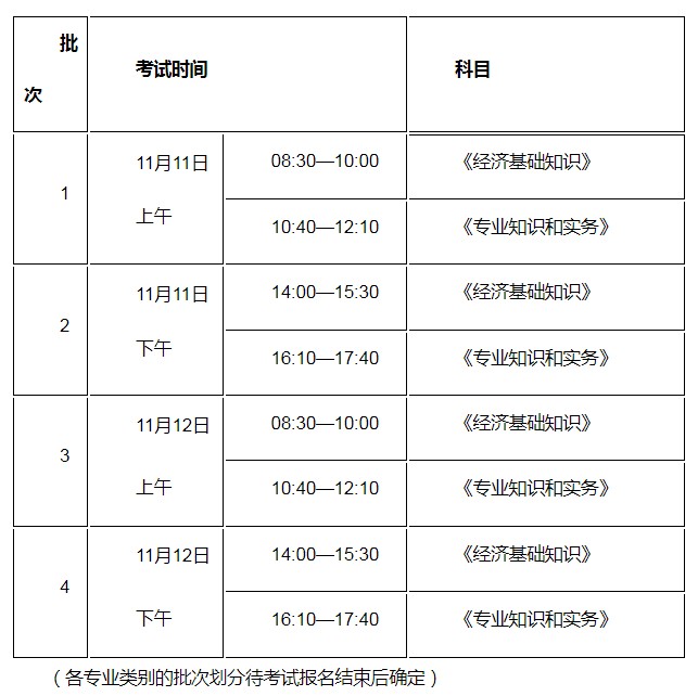 考试总共安排有11月11日上、下午,11月12日上、下午4场8次考试。考试科目为《经济基础知识》和《专业知识和实务》,均为电脑上机考试。