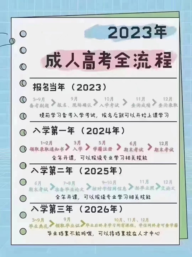 拿文凭流程:现在备考 → 9月报考 → 10月考试 → 12月录取 → 明年3月入学 → 线上学习+期末考2.5-3年 → 申请毕业 → 拍毕业照拿文凭