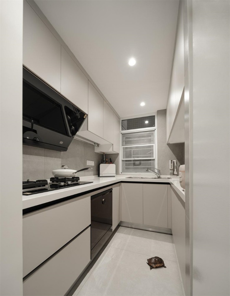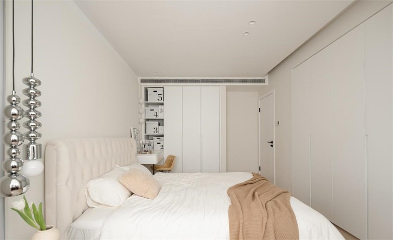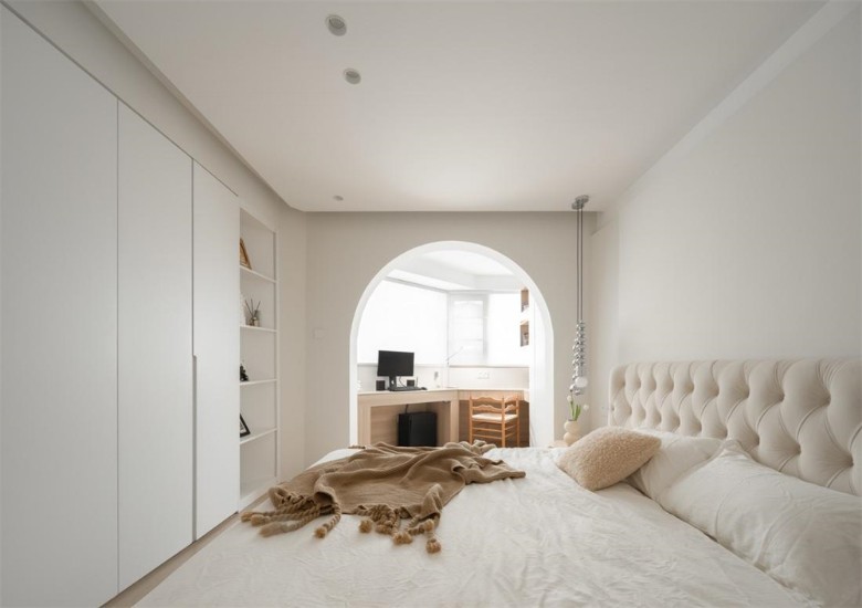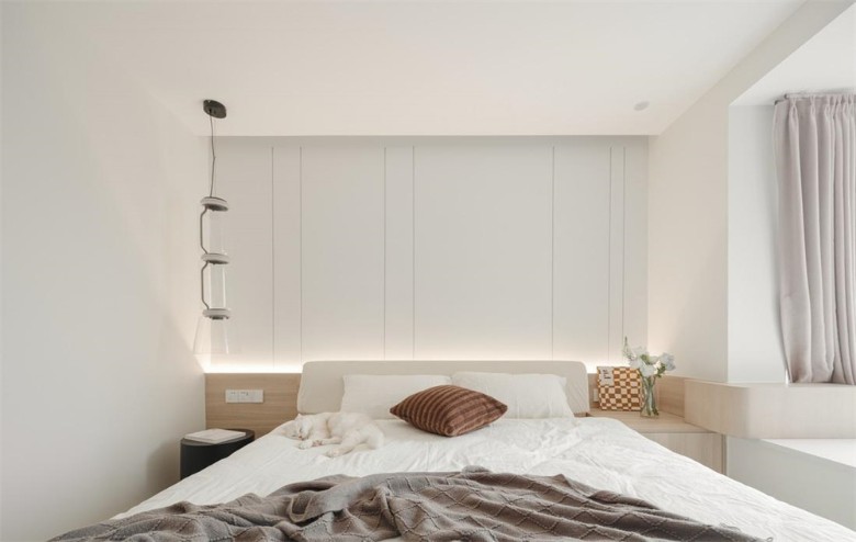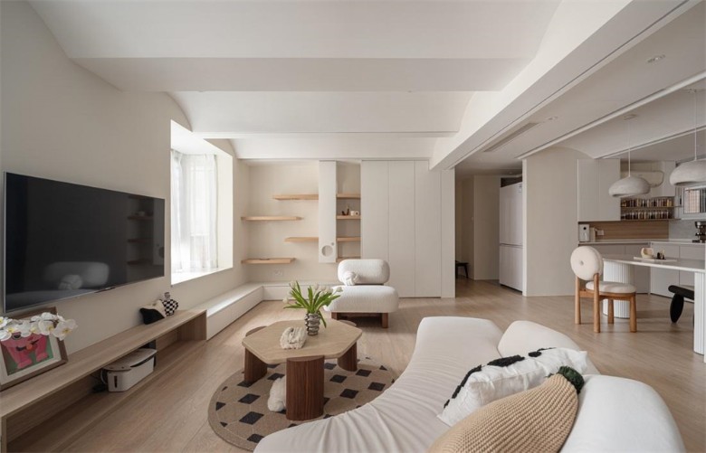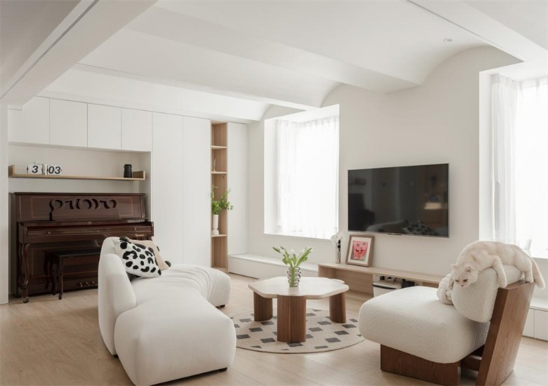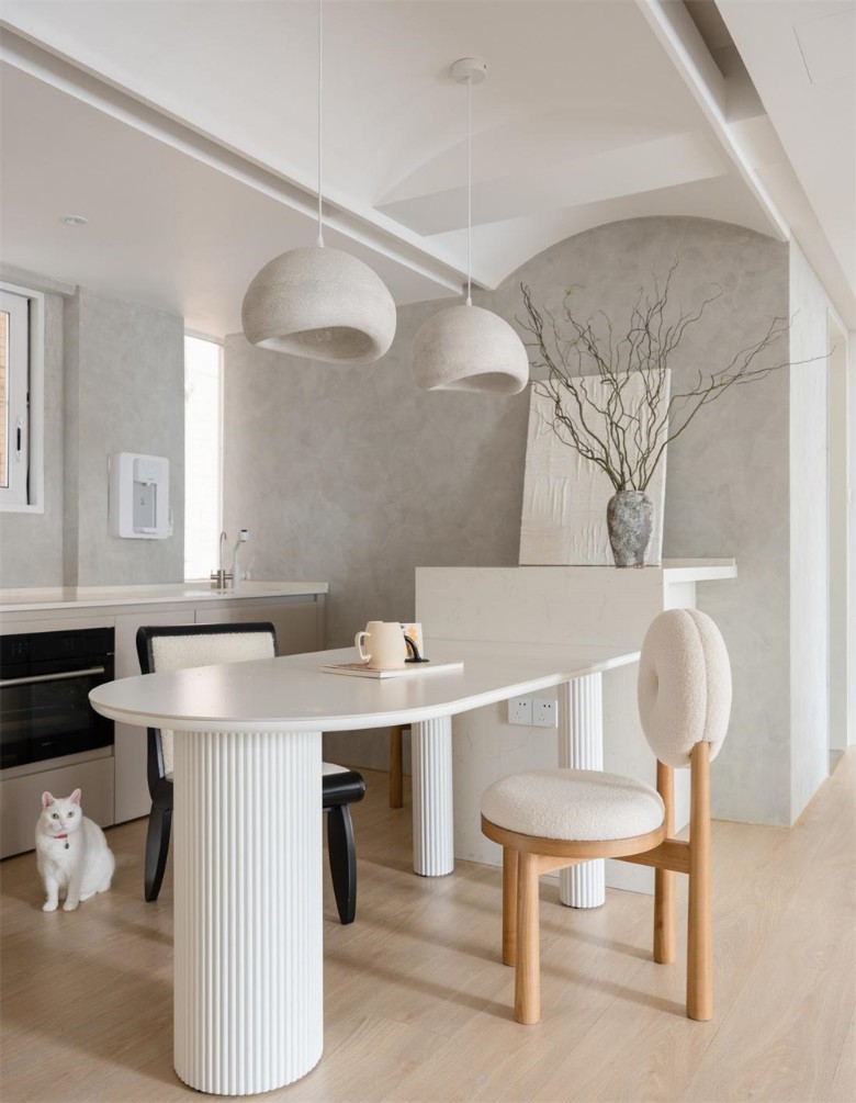 设计亮点: 本案例以北欧风格为主,设计师巧妙地利用拱形吊顶、简约家具和自然光线,打造出一个简洁干净又不失温度的空间,同时充分考虑了猫咪的活动空间和主人的生活习惯,体现了设计与生活的完美融合。客厅改造前是两个卧室,一个是右上角zz的房间,右下角的房间基本被用来堆放物品。因为餐厅方向挨着对楼,房间接收主要光源,墙体的分隔完全阻挡了,空间也没有被利用到。打通后的格局中间有条结构梁贯穿客餐厅,梁离地2.3m,老房层高仅2.6m不到,为了弱化结构同时尽可能的预留层高,设计了连续的拱形吊顶,同时也起到很好的装饰效果,增强视觉张力和延伸感。