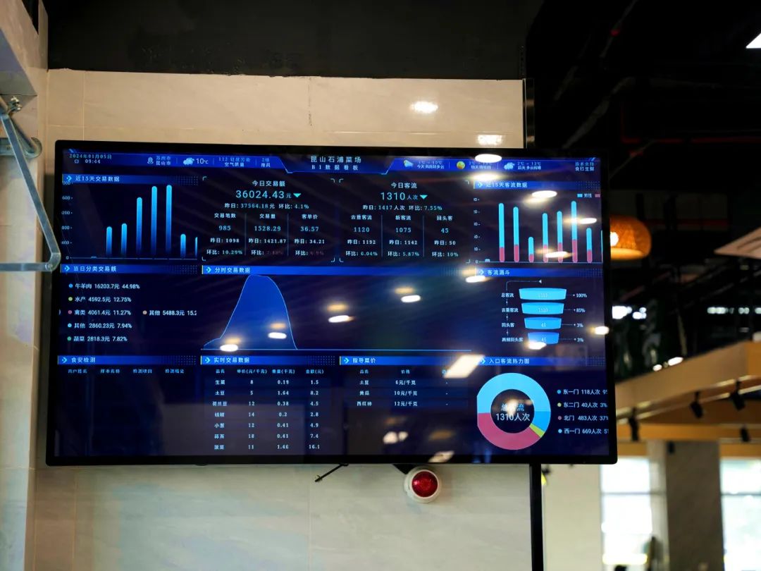 同时,依托数字化信息化手段,打造市场AI电子地图,精准标注业态区和线路图,方便居民采购食材。引入AI智能电子秤,实现食材种类、总量、价格的一键显示。同时,每个摊位上方设置电子显示屏系统,实时向居民推送商户信息、菜品菜价等内容,并推出评价机制,提升商户规范经营意识。此外,市场还与食行生鲜合作,打造线上购平台,实现菜品精准送达“家门口”,方便居民百姓网购需求。