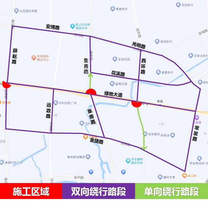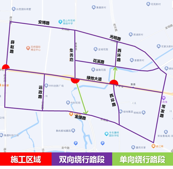 绿地大道与西环路和集善路交叉口分阶段半幅封闭施工期间,机动车辆可从光明路、安博路、绿地大道、金捷路、薛赵路、远政路、集善路、西环路、常发路等周边道路绕行;非机动车辆和行人按照现场指示标志和引导正常通行。