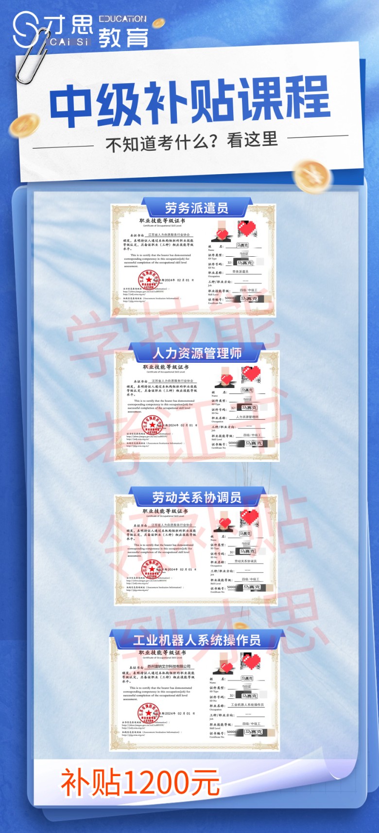 昆山职业技能补贴、初级证、中级证、高级证补贴类课程,到才思学技能,领补贴