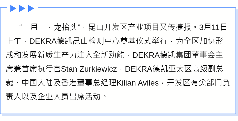 昆山检测中心不仅仅是一个全新的物理空间,也是DEKRA德凯集团深耕昆山开发区、加码昆山开发区的一个生动缩影。Stan Zurkiewicz表示,昆山开发区拥有强大的产业基础,特别是在电子、信息技术、汽车、机械和先进制造等领域产业优势明显、集聚效应突出,集团将以此为全新起点,继续秉持专业的技术水平和最高的服务标准,不断增强检测认证服务能力,进一步助力合作企业提升全球市场竞争力,为昆山开发区加快建设全国一流现代化示范园区贡献企业力量。