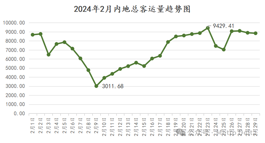 2月内地日均客运量在春节假期影响下与1月相比有较大下跌,与去年基本进入常态的2月比也有近一成下跌。