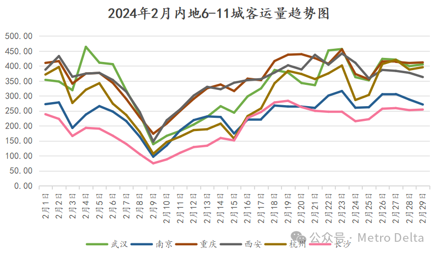 6-11六城也打破了以往互不相交两个梯队的格局。本月春节假期期间主要为西安、重庆表演,两市在春节假期期间均有过登上单日第五的表现,并一度逼近第4的深圳,节后第一周普通工作日也仍位居高峰。武汉在2月头尾两轮降雪潮中有较大拉升,但春节假期被南京反超数日。杭州本月多数时间都在“挨揍”,不仅未有单日第六,甚至同样被南京压制多日。南京春节假期表现较以往强势,夫子庙等寺庙客流众多,春节假期连续5天客流压制杭州。长沙春节假期前段也受“逃离”影响而下降较多,但节后反扑最为凶猛,随后回归250w附近盘整。