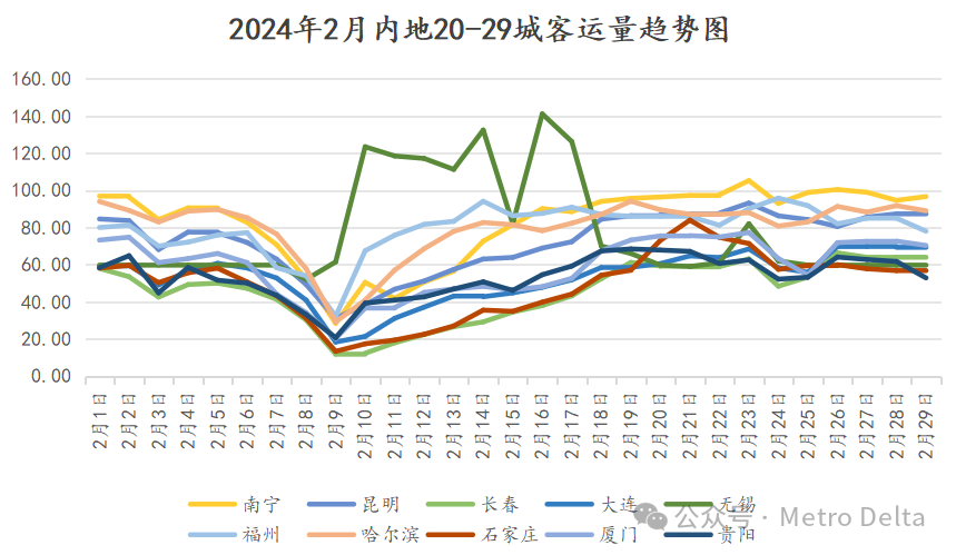 本月该梯队客流总体仍然为上疏下密。南宁仍为工作日最接近百万的城市,节后最高的周一一度实现突破,但随后又开始回落。哈尔滨上旬客流与南宁接近,春节假期在冰雪大世界等景点帮助下持续位居高位,但节后仍然上攻乏力。无锡、福州异军突起,尤其是无锡在春节假期共7天破百万,三度创历史新高!节后其基本盘大致达到了60w,较去年同期也有较大上涨。昆明、贵阳节假日表现也较稳定,与西南旅游需要在此中转或有一定关系。大连、厦门、石家庄、长春趋势类似,春节位于低谷,旅游也处于淡季,石家庄在暴雪天气带动下节后有所冲高。