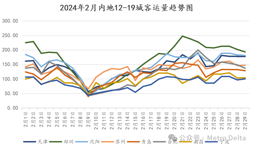 郑州在春节假期之外已经拉开和梯队内其它城市差距,日均200w正在向它招手。沈阳、天津旗鼓相当,而苏州在春节假期领先优势显著。合肥。宁波假期因流动人口减少而明显下跌,节后方才快速回血,合肥在雨雪天气影响下节后首个周五离200w仅一步之遥,创工作日新高。青岛仍处于淡季,客流较为低迷。南昌也展现了一定的节假日型特点,但目前尚未彻底站稳百万。