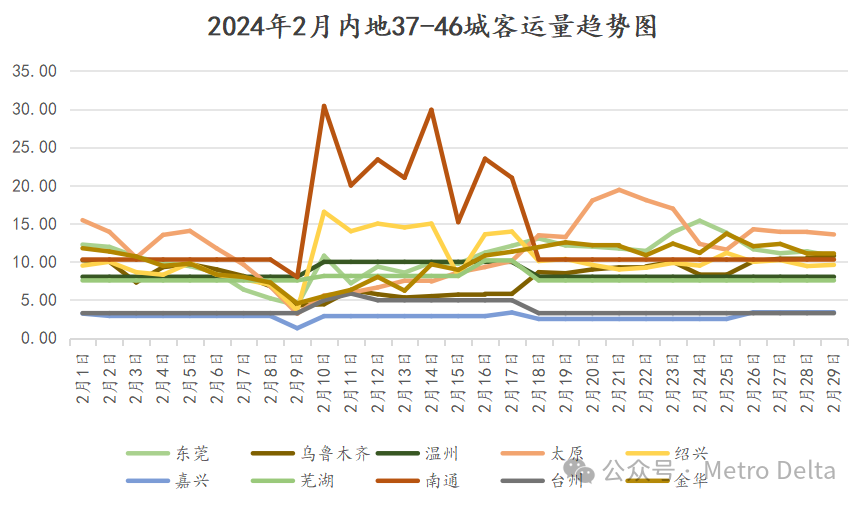 该梯队数据缺失较多,温州、海宁、台州为根据春运数据估算。绍兴和南通为节假日冲高类型,尤其是南通,在免费乘车带动下大年初一突破30w。太原节后也因恶劣天气有过拉升。春运期间整体上涨的还有温州、芜湖、台州等,基本维持平日水平的为东莞、海宁,下跌的为金华、太原和乌市。金华、东莞平日虽为节假日型,但因外来人口也较多,客流在春节假期仍然下滑明显。