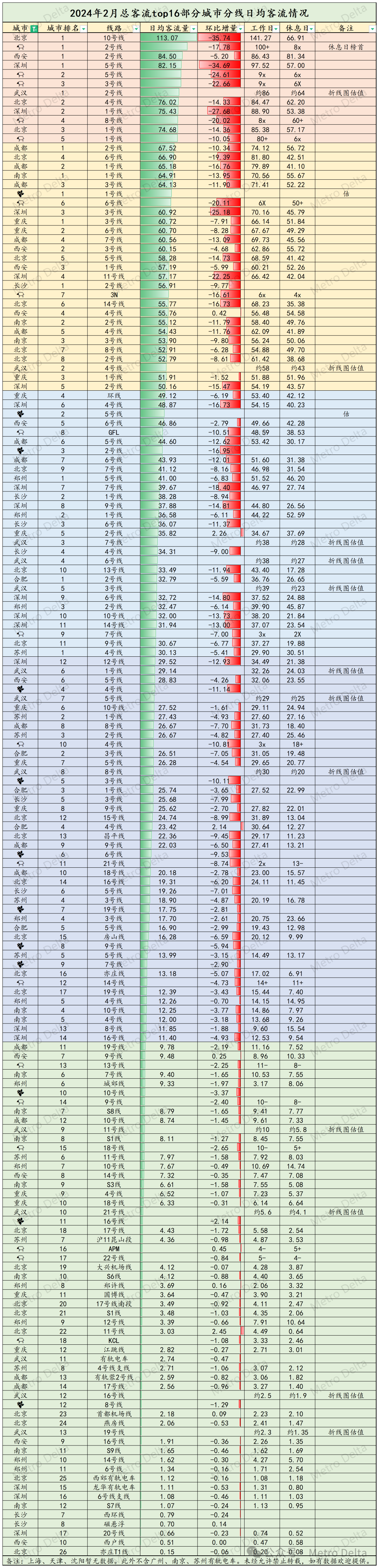 和2023年2月相比,涨跌互现,20城上涨24城下跌, 涨幅实现翻倍的有温州和南通,均为开通了第二条线路,加上春运本身高企带来的客流上涨。跌幅跌量均为最大的为上海,原因和上面类似。且本月上海天气较差,客运量和北京差距较以往小了许多。