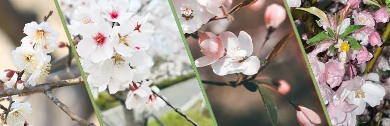 梅花:花期最早,开花不见叶,几乎没有花梗,有淡淡的香味,单朵开放,花开紧密,花瓣小而圆,树干表面粗糙。