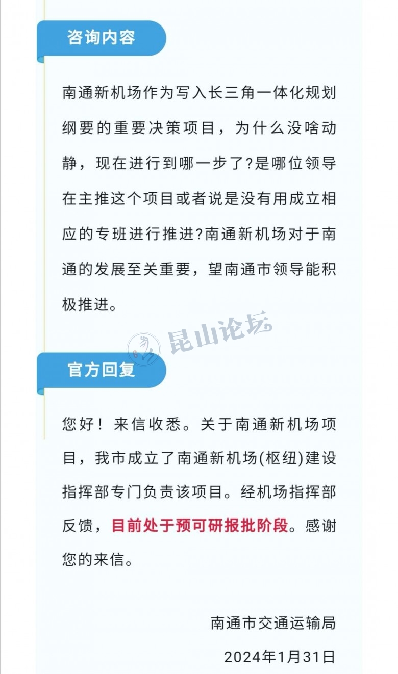 关于南通新机场项目,我市成立了南通新机场(枢纽)建设指挥部专门负责该项目。经机场指挥部反馈,目前处于预可研报批阶段。