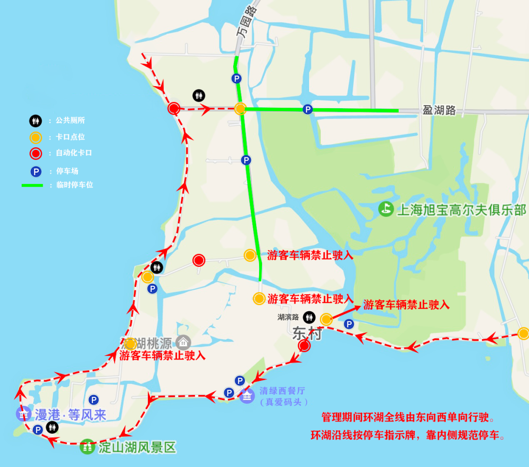 自2024年3月30日起,每逢周末及节假日,环湖大道车辆采取由东向西单向行驶交通管理。游客统一从双永路驶入,盈湖路驶出。管理期间沿线其余路口均无法驶入环湖大道!