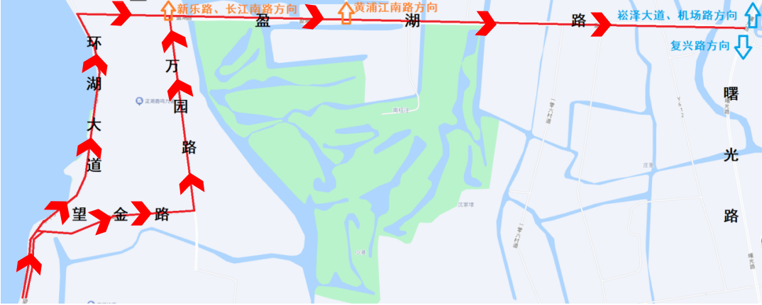 回程时,可选择望金路或盈湖路驶出环湖大道,沿盈湖路向东行驶至曙光路,崧泽大道及机场路方向向北分流、复兴路方向向南分流。