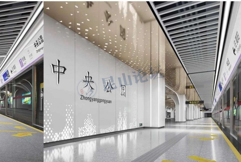 展台连续的6个座椅,高低错落,深浅对比,组合而成一个整体,六边形代表稳定融合、十全十美,也满足无障碍的规范要求。结合铝板冲孔形式和中央公园周边的著名建筑,把最有代表性的建筑剪影融合到站名墙上,既打破了呆板的形式, 又具有现代感和科技感。