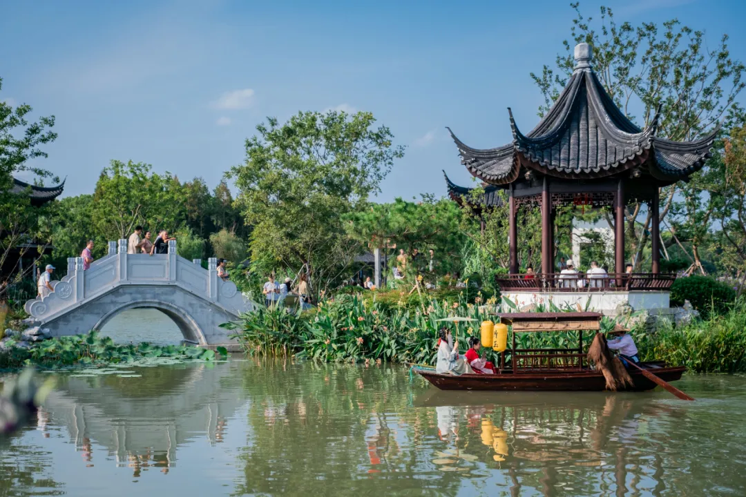 坐于船上,徜徉河间,眺望曲池风光