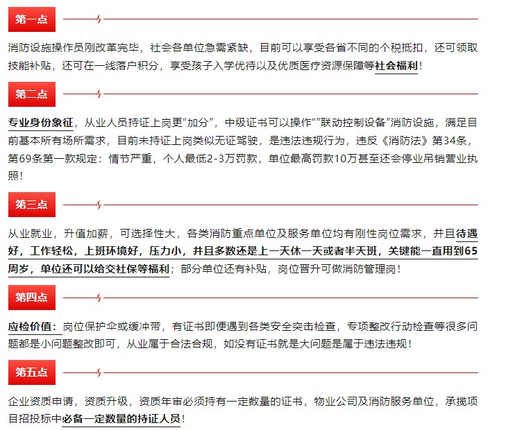 消防设施监控操作:可从事消防设施的监控、操作、日常保养和技术管理与培训等工作;