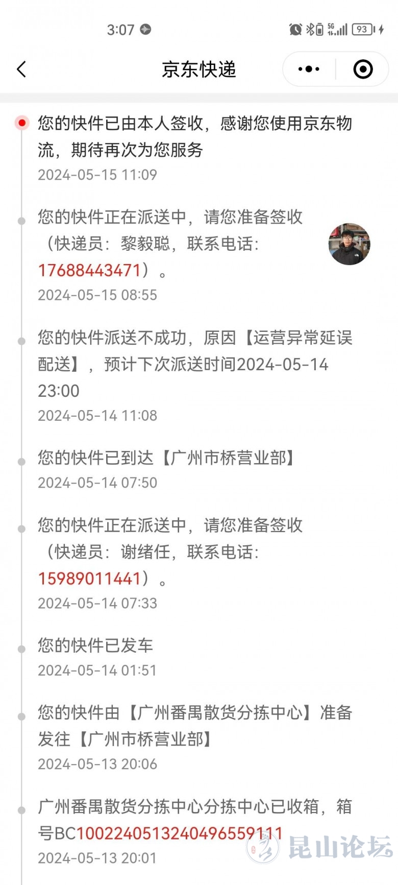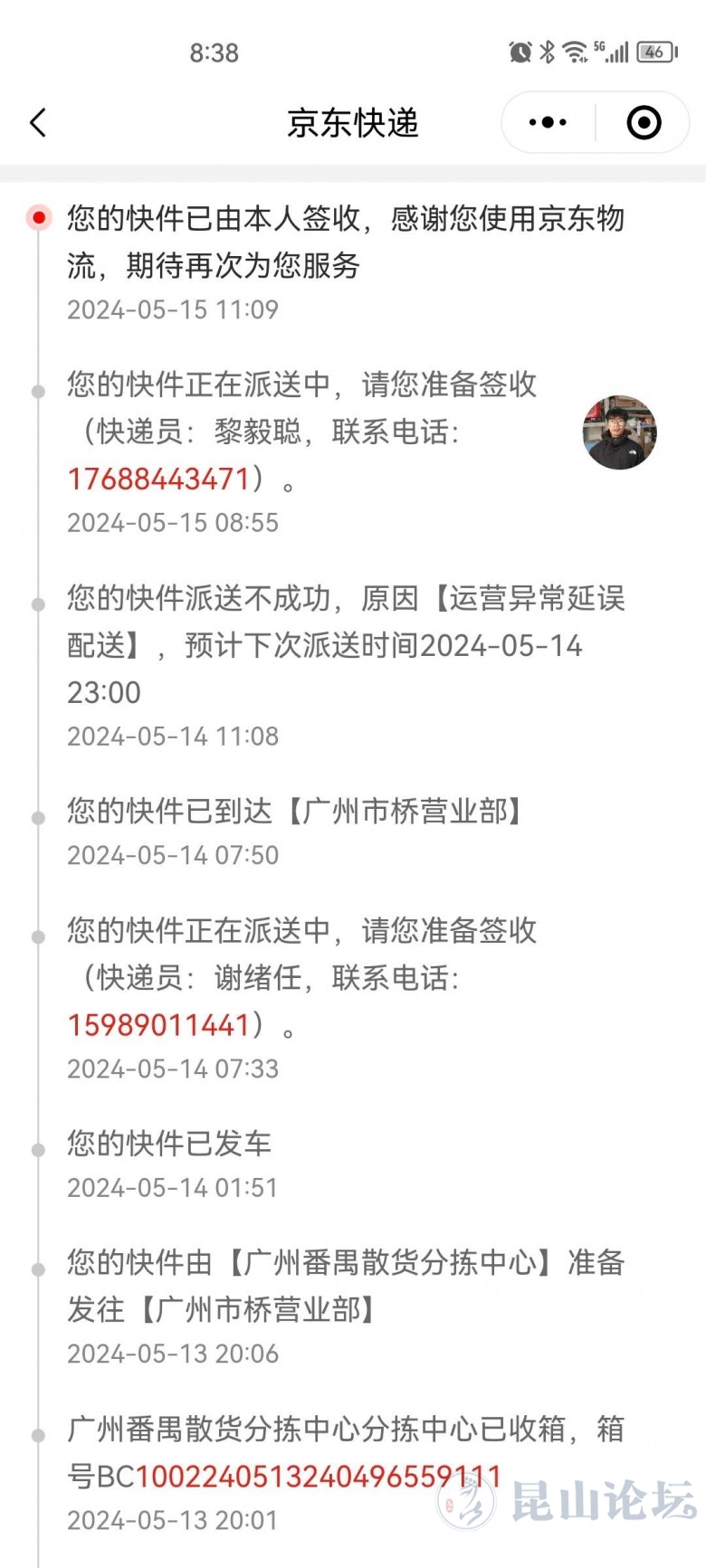 5/14号8点多显示在派送,我联系平台上提供的派送员电话,对方说是营业部有几千货物无法拦截,让我联系客服处理,联系京东客服说在途中无法拦截,那我改派件地址,客服回复同城改件收费5元并且时效延后,这些我都同意。于是我的糟心经历开始了。