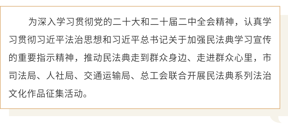 3. 摄影类:单幅或组照(不超过8幅)均可,重点展现群众日常生活中各种与法有关的瞬间,内容写实,黑白、彩色均可,不得侵犯版权。文件格式为JPG,不小于3MB。