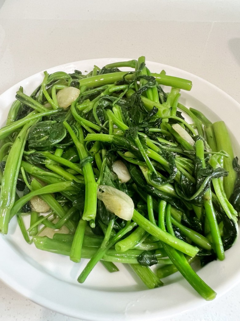 中午就炖半只鸡,炒了鸡蛋,烧了冬瓜和一盘空心菜。