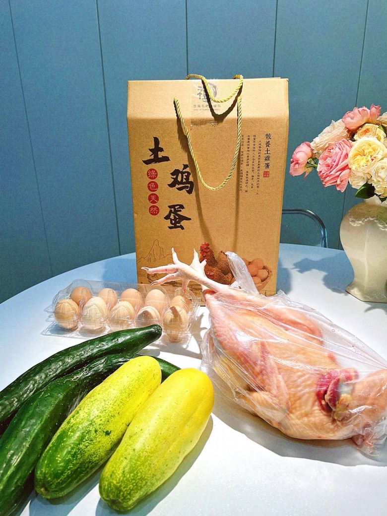 老板说刚刚鲨好的鸡,还送了几根老黄瓜。