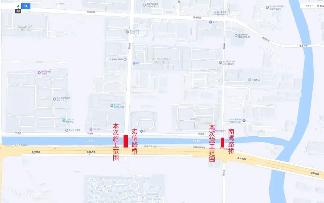 施工期间该区域全线封闭,设置围挡进行隔离,设置相应的交通设施和标识标牌。期间,机动车与非机动车在施工区域内均无法通行,可选择绕行路线:善景路——黄浦江路——南浦路——景唐南路
