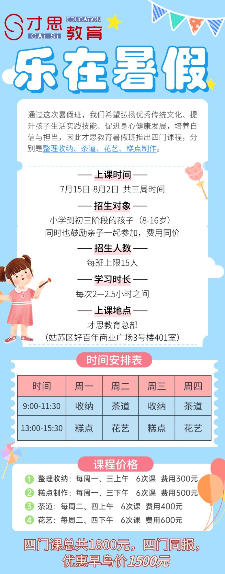 通过这次暑假班,我们希望弘扬优秀传统文化、提升孩子生活实践技能、促进身心健康发展,培养自信与担当,因此才思教育暑假班推出四门课程,分别是整理收纳、茶道、花艺、糕点制作。-- 上课时间7月15日-8月2日 共三周时间可选择单科学习,也可选择全套课程学习。全科学费共1800元,前10名报名特惠1500元。--招生对象 --小学到初三阶段的孩子(8-16岁)同时也鼓励亲子一起参加,费用同价--招生人数 --每班上限15人--学习时长 -每次2-2.5小时之间--上课地点-