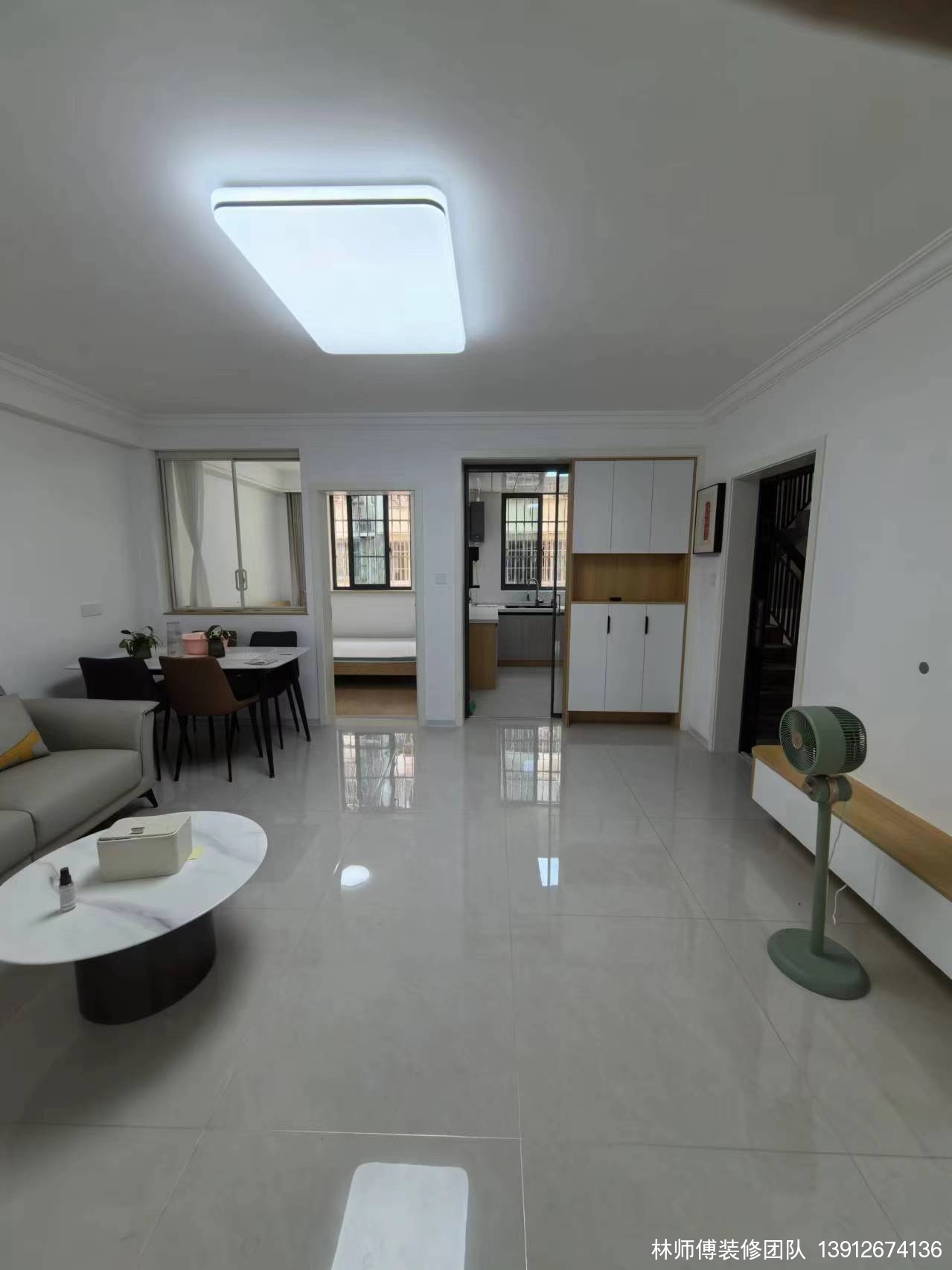 进门玄关,一面到顶的鞋柜让玄关的收纳实现了最大化,电箱用画框遮盖,更好看了。北面的小房间与客厅之间开了一扇窗,有利于光线通过,保证家里的采光和空气流通。