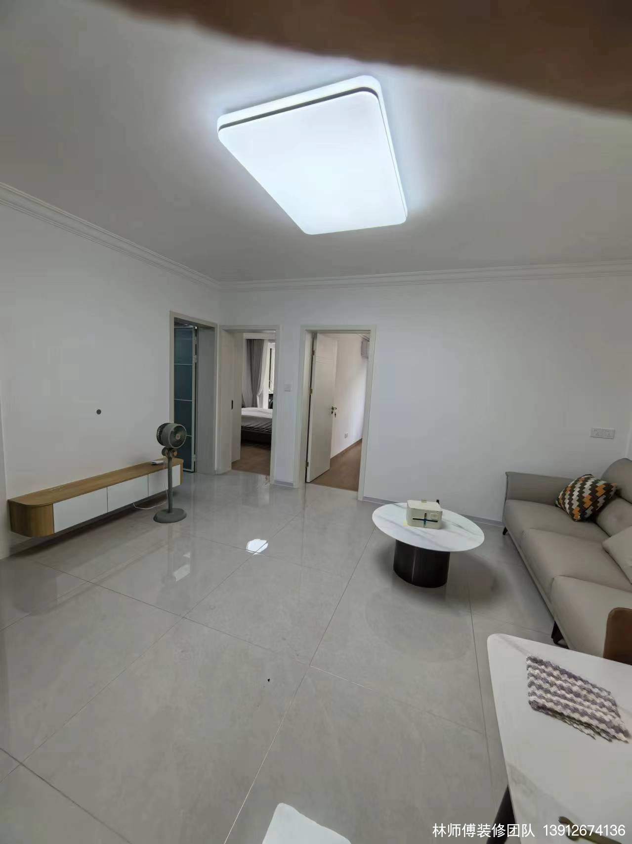 客厅,一张三人沙发,简约又舒适,用圆形小茶几代替笨重的老式茶几,不仅看起来更轻盈,整个空间也跟着变大了不少。电视柜也是木工打的吊柜,不仅能装,性价比还高。