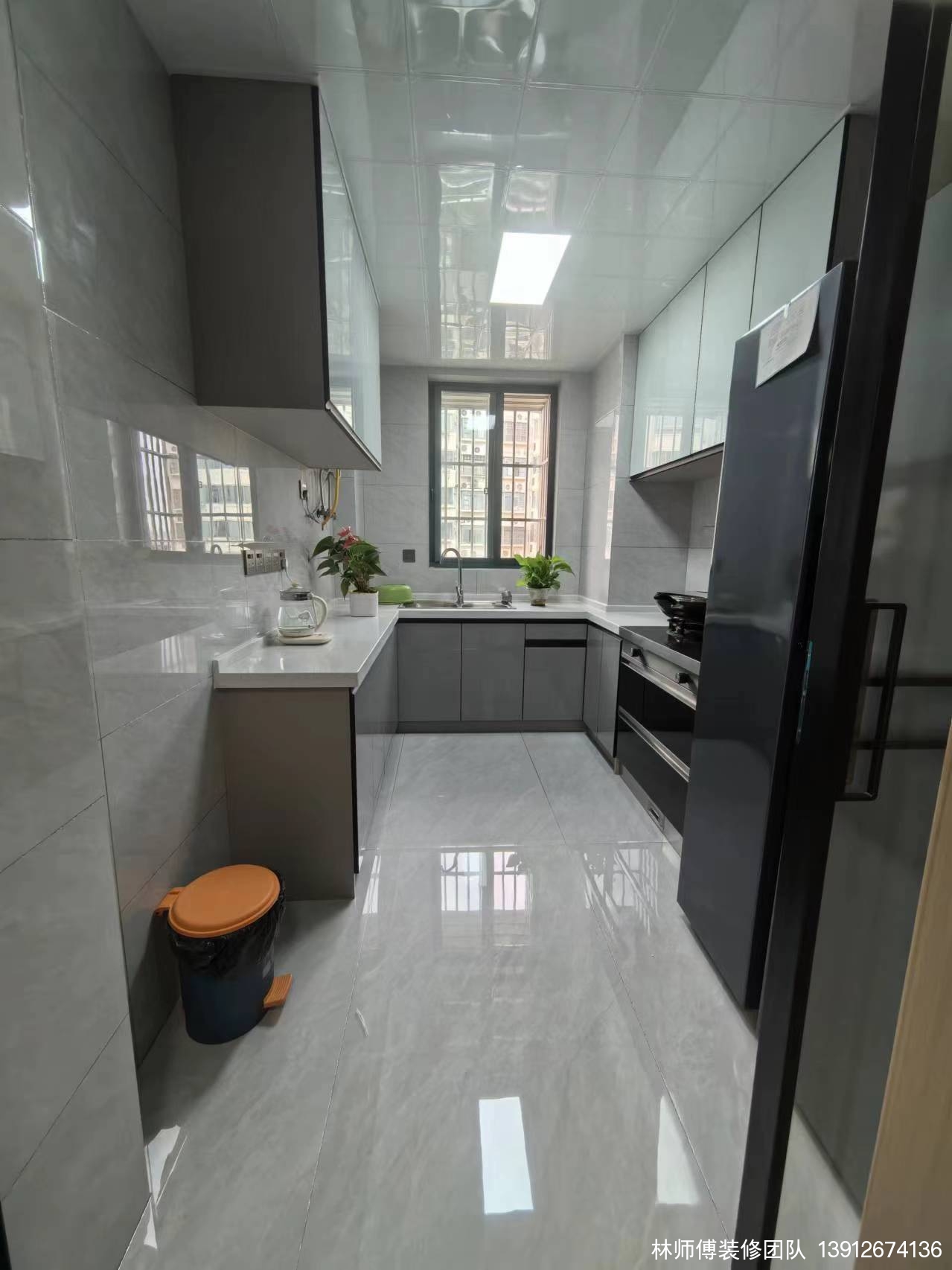 进门右手边就是厨房,u型操作台和二字型吊柜,让整个厨房的收纳能力实现最大化。