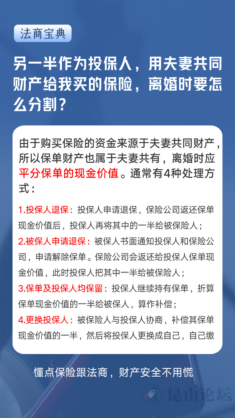 用夫妻共同财产买的保险,离婚时通常是需要平分现金价值的。如果被保人想继续享有保单权益,可以给予投保人相应的补偿,然后把投保人变更成自己。