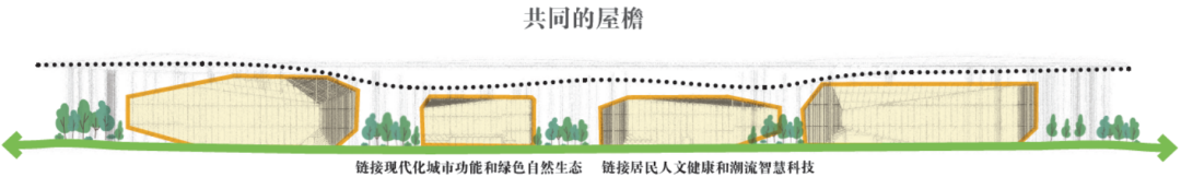该项目整体设计结合“科技晶体”与“智慧森林”,链接现代城市功能与绿色自然生态,链接潮流智慧科技与居民人文健康。流线形态的膜结构棚架塑造“共同的屋檐”,其下四个晶莹剔透的钻石形建筑体量,打造千灯镇的新地标。