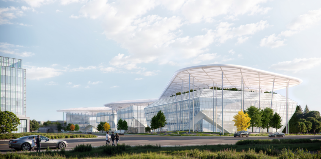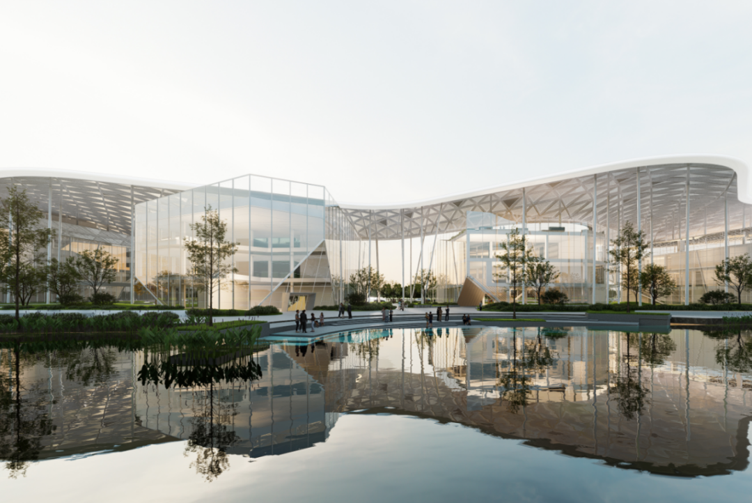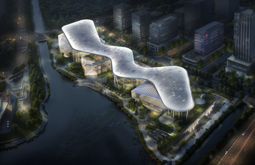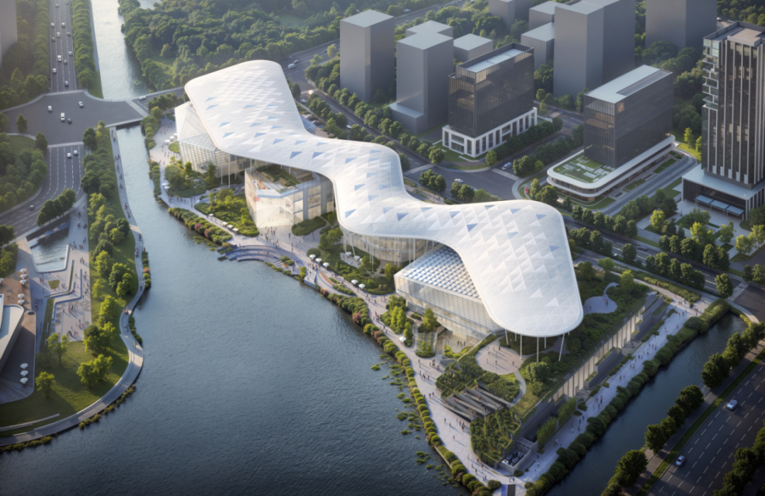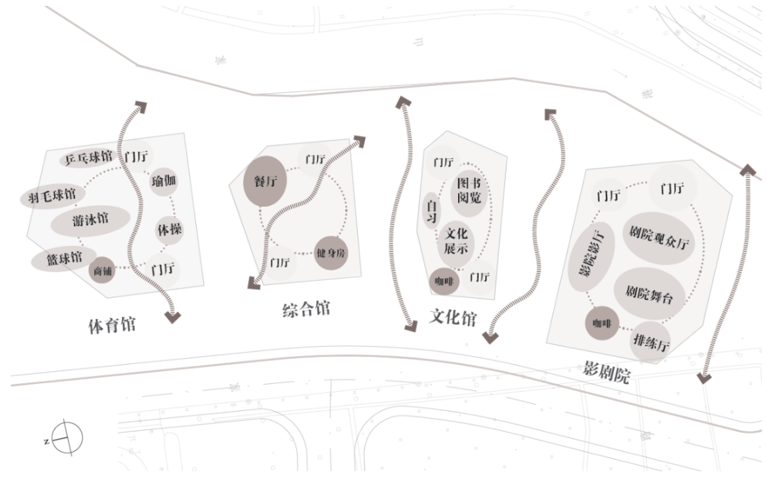 四个建筑单体自北向南分别为体育馆、综合馆、文化馆、影剧院,容纳体育、商业、文化、演艺功能,场地上设置各类活动场地、滨水空间、多层次绿色开放空间,营建充满活力的24小时城市客厅。