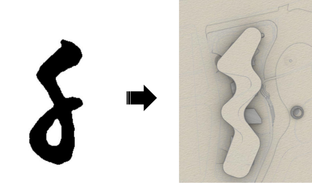 膜结构棚架的形态来源于“千灯”的“千”字草书,同时契合场地形态,从周边办公塔楼上、途经的飞机上可俯瞰观赏此大地景观,极具设计感。