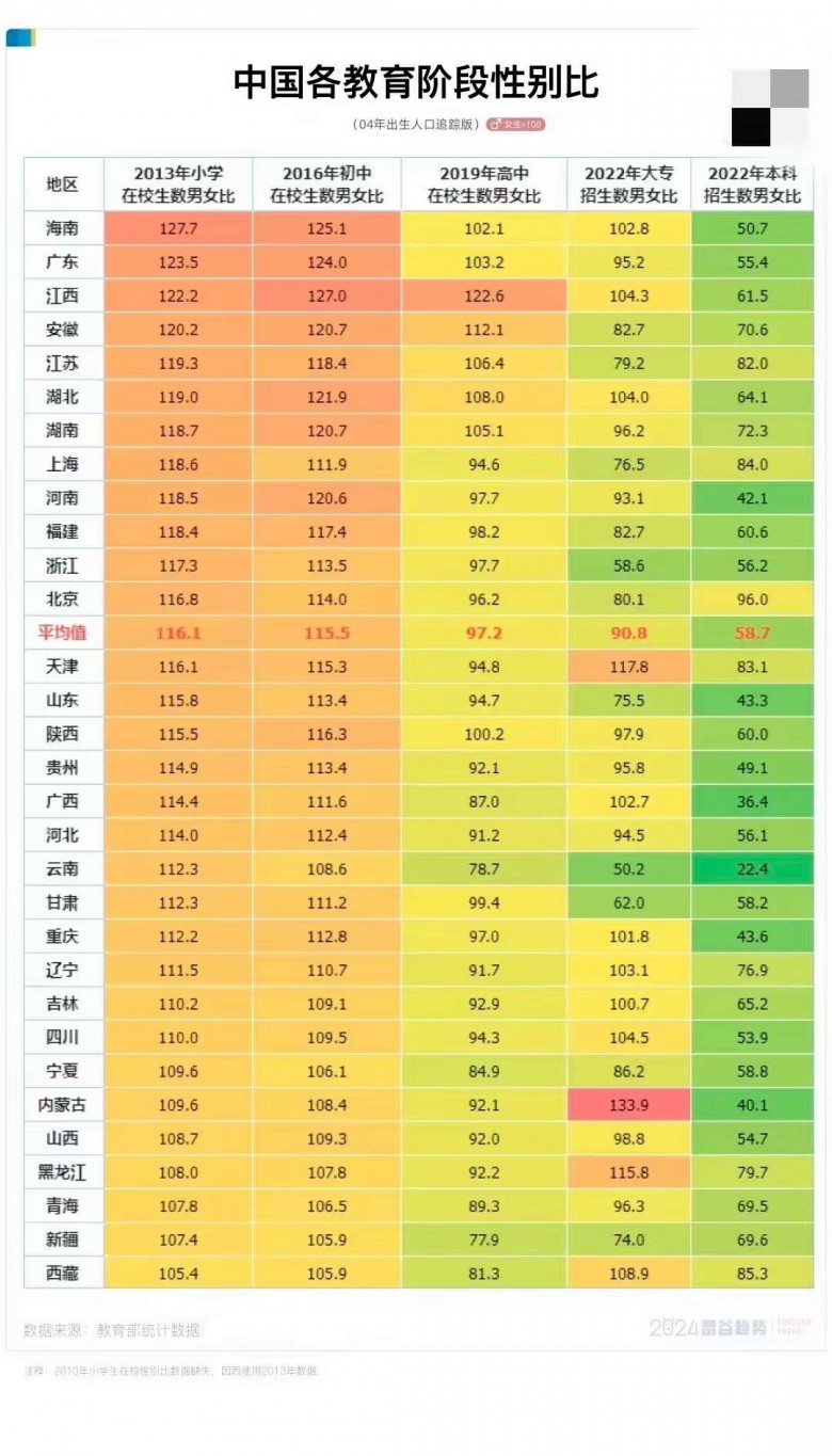 根据公开的数据显示,中国各教育阶段性别比是越往后,女生占有的比例却是越大。传说中的开窃男生现象并不存在。